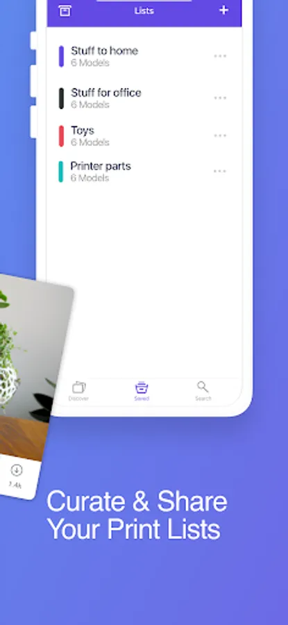Swipe through over 600K(!!) free, downloadable 3D print models and curate your own print list.