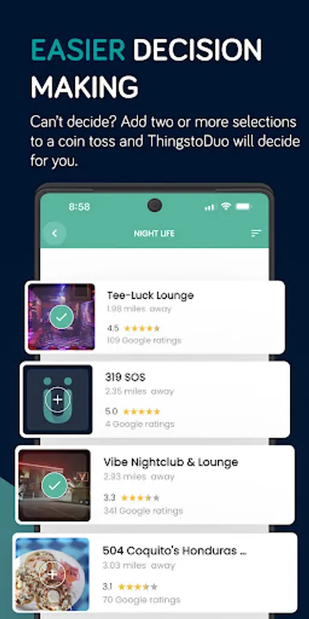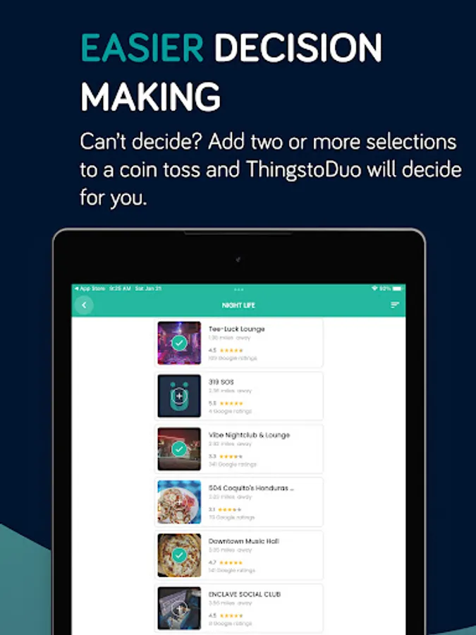 With ThingstoDuo, you can easily search or sort by category and find things to do anywhere in the world! You can also make decisions with a coin toss and save your favorites to your user profile. Plus, our app offers exclusive discounts from local businesses, so you can save money while having fun.