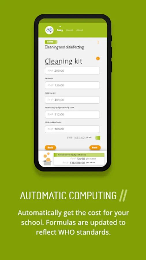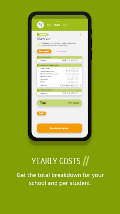 This tool supports you in calculating the Operation and Maintenance (O&M) costs for water, sanitation and hygiene in school activities. The app also calculates the costs for proper cleaning and disinfection in accordance to WHO recommendations. Enter your data and see how much you spend on O&M now. In addition, the app can estimate how much to improve your schools WASH services. You can see the result immediately. You can also request to have the results sent to you via email and use them for your school’s budgeting.