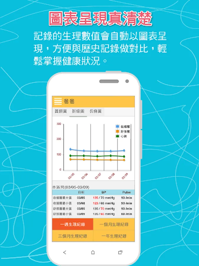 -透過分析工具自動將您的生理數值區間分類,簡易圖表更容易查看與比對紀錄。