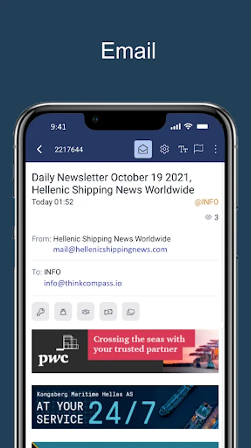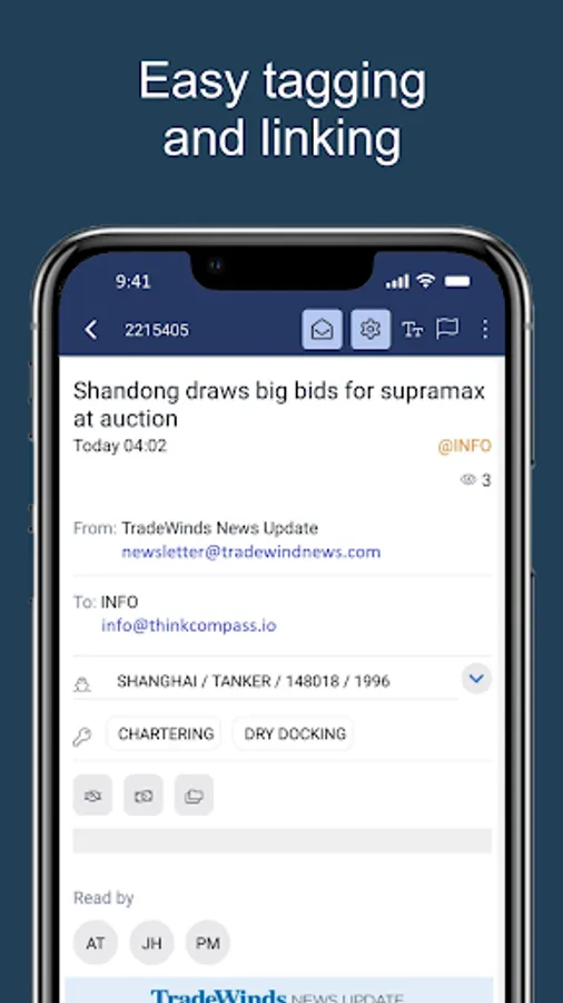 myCompassAir is the mobile app for use with CompassAir software. Used throughout the global maritime sector, it has been purpose-built for Ship Owners, Managers, Chartering and Sale & Purchase Brokers to simplify collaboration for teams and improve productivity wherever you happen to be. CompassAir combines a powerful messaging platform with a comprehensive shipping database with optional modules for Sale & Purchase and Chartering.