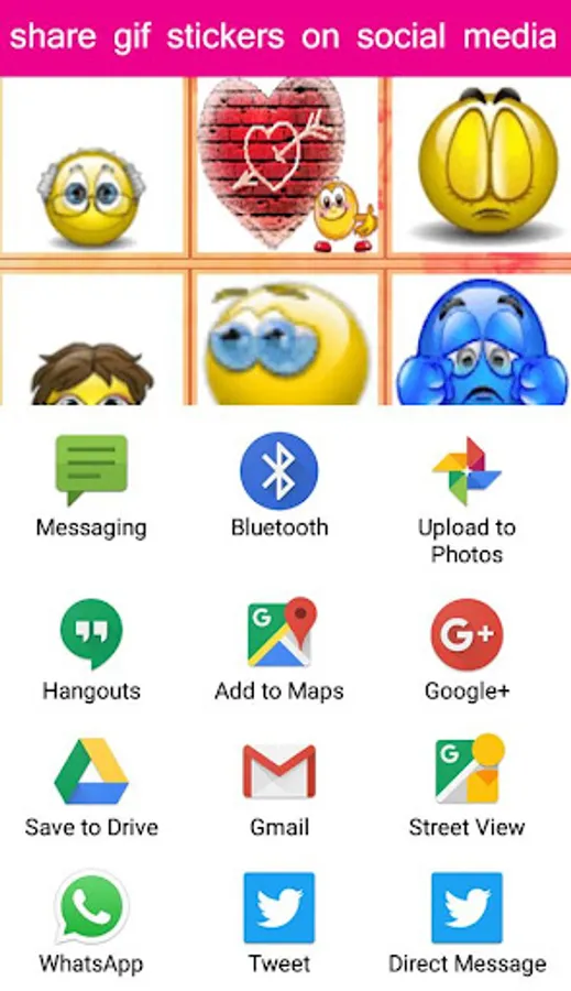 Presenting before you the best collection of stickers and gifs that you haven’t seen before. These stickers are designed in such a way that it can help you express your feelings and emotions most efficiently. These big and lively emoji will not only make your chat interesting and attractive but will also help you to make the other person smile. Each and every sticker is unique in its own way. Give a special look to your conversation using this app now.Add to favourite to make your own library and for quick access.