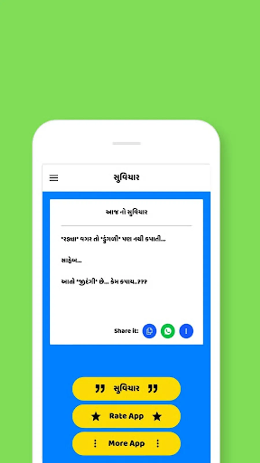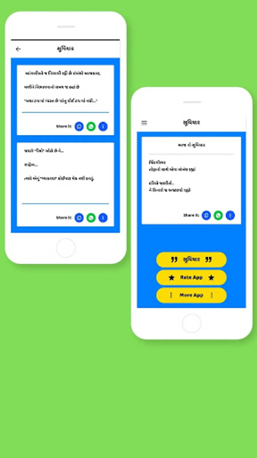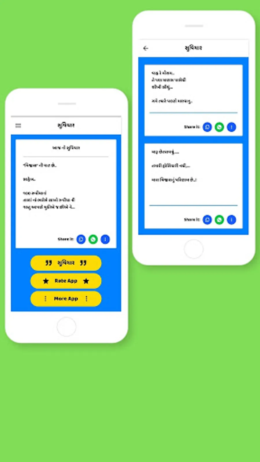 • સૌથી સરળ રીતે શેર કરો: વોટ્સએપ, ફેસબુક, અને વિવિધ સોશિયલ મીડિયામાં તમારી મનપસંદ સુવિચારો શેર કરો.