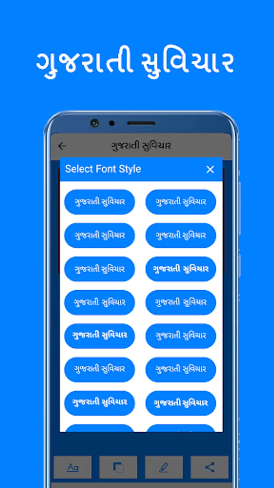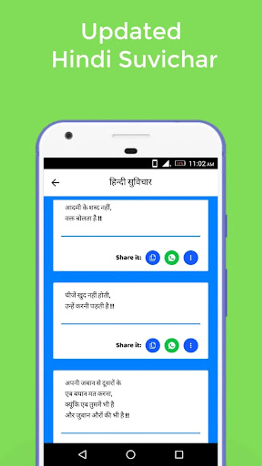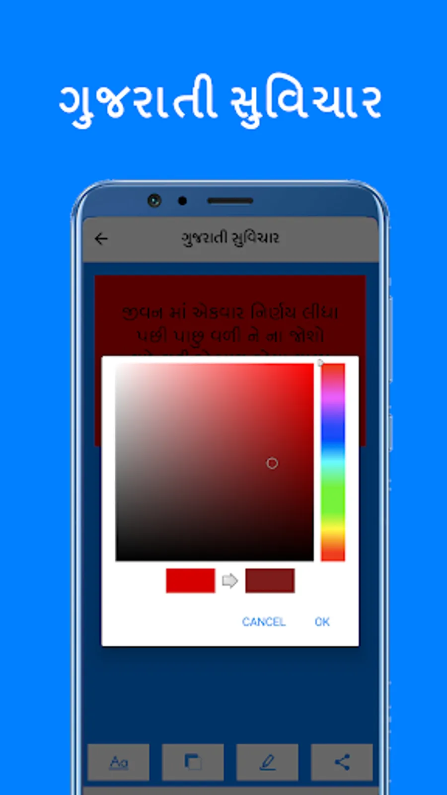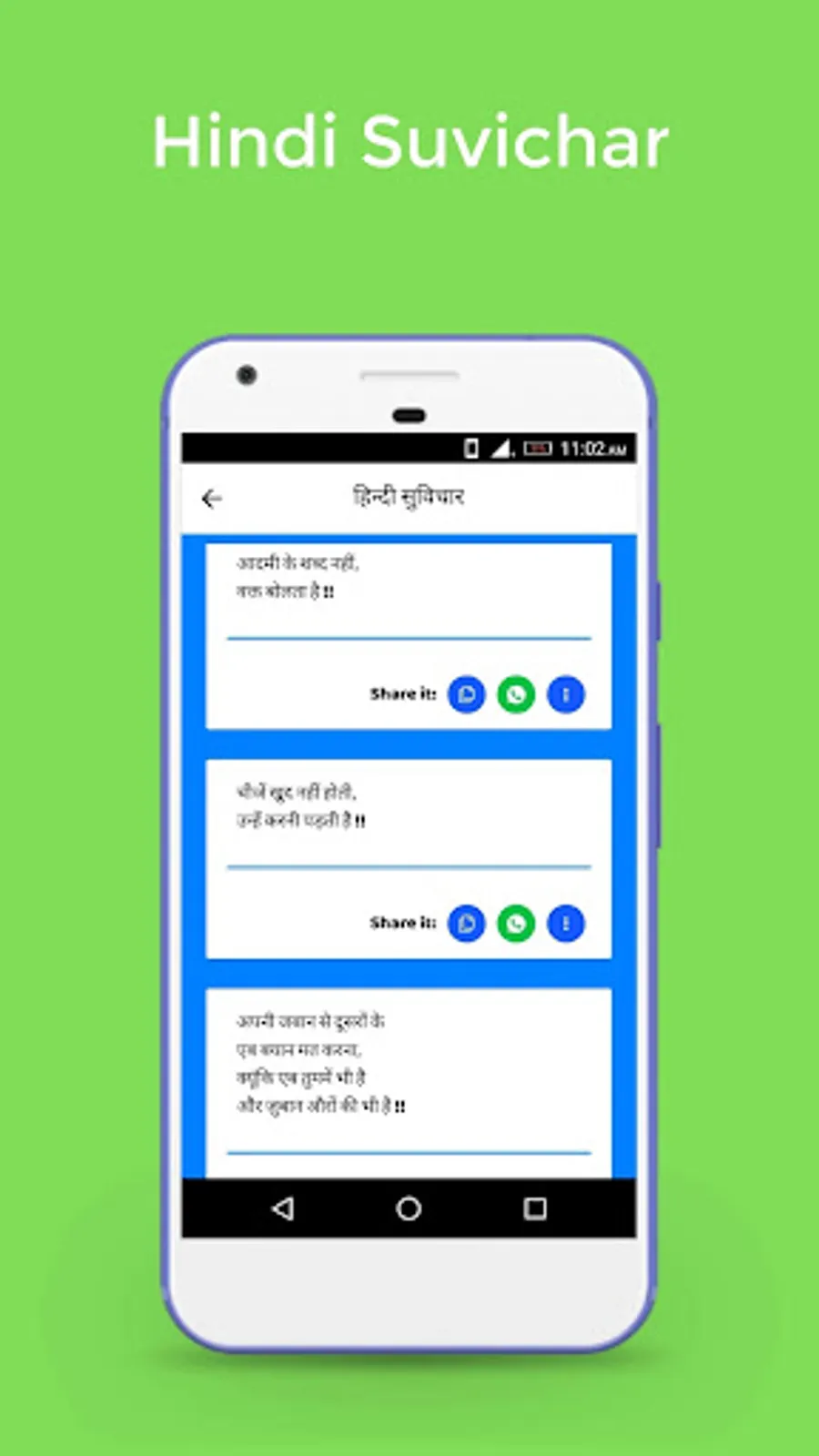 • સૌથી સરળ રીતે શેર કરો: વોટ્સએપ, ફેસબુક, અને વિવિધ સોશિયલ મીડિયામાં તમારી મનપસંદ સુવિચારો શેર કરો.