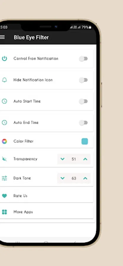 App also have notification control to turn off and on the blue light screen filter from notification any time without leaving any app you are using.