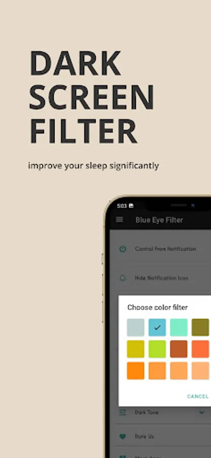 App applies an overlay color filter on your device screen to darken the screen. It helps to avoid headache and eye pain at night.