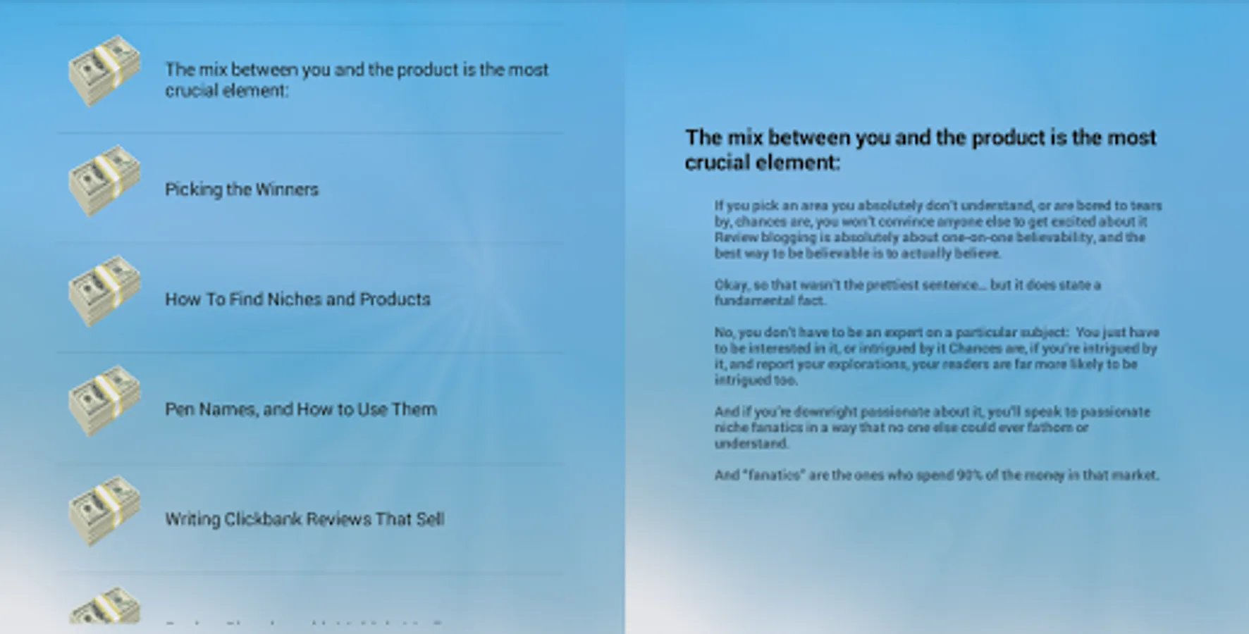 All the information needed for you to get started making money online by selling Clickbank products is in this guide.