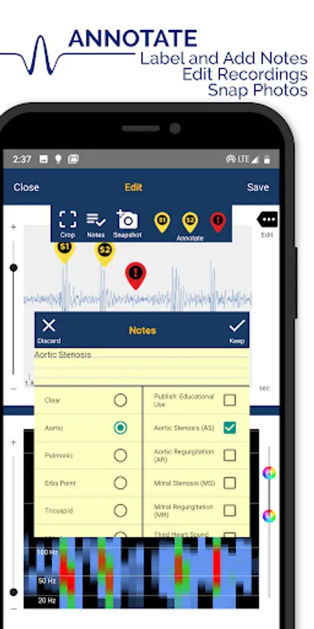 - The phonocardiogram can be annotated with S1, S2, and ! markers to call out areas of concern