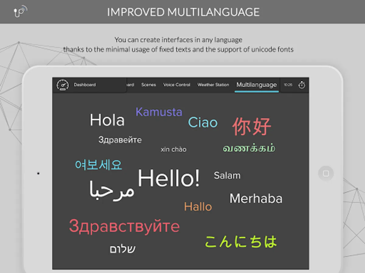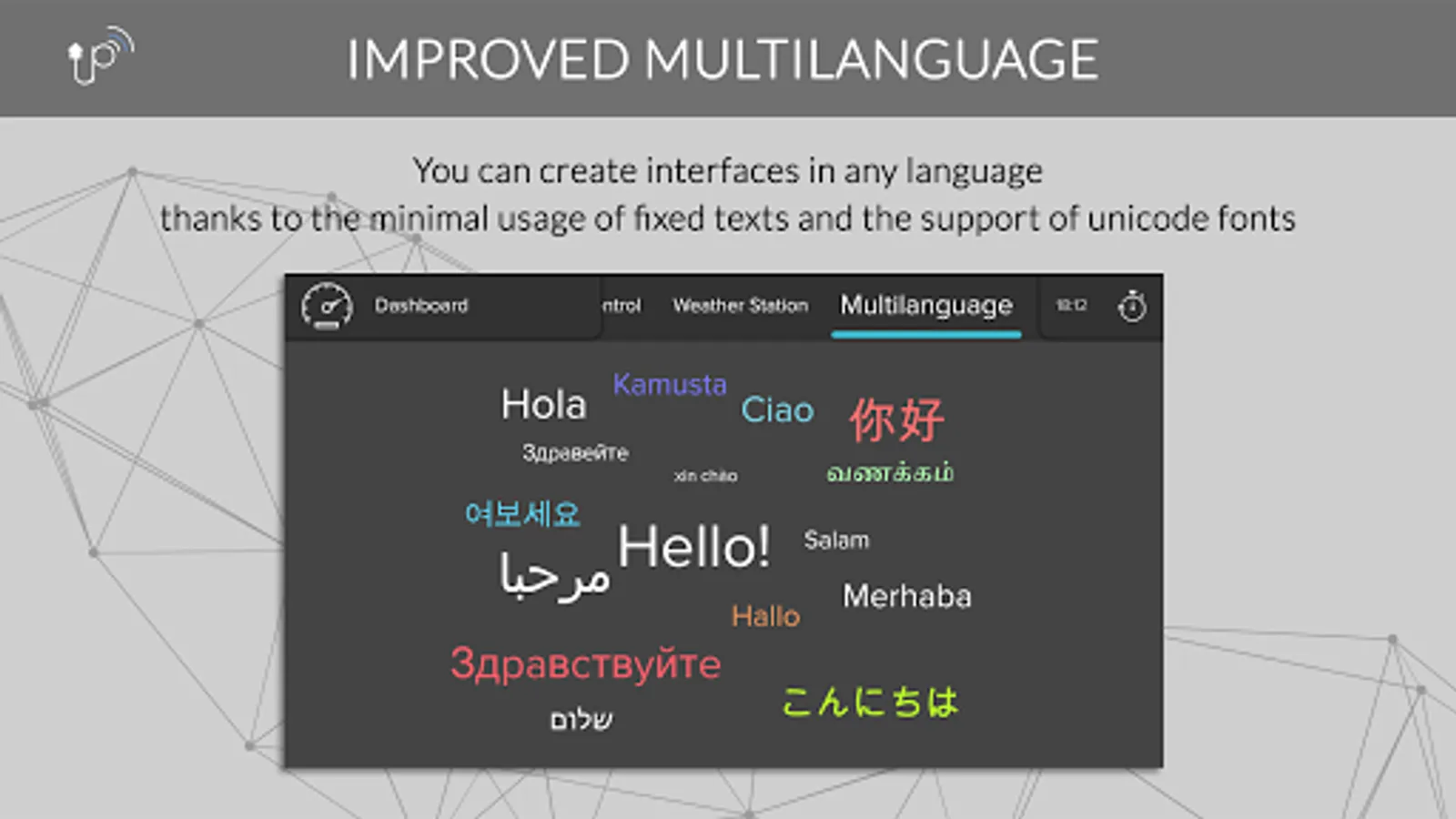 -Interfaces in ANY LANGUAGE can be created thanks to the minimal usage of fixed text and the support of unicode fonts.