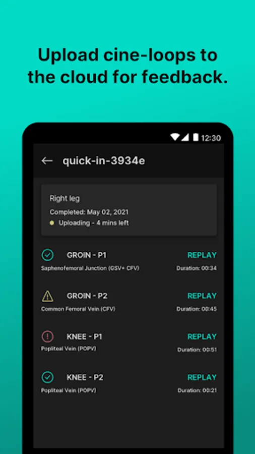 2. Connect your mobile phone or tablet to an external B-mode ultrasound device. Follow a standardized scanning protocol. Receive AI-guidance to help you acquire ultrasound cine-loops. The videos are stored automatically and can be reviewed in the app and via an external web platform to receive feedback from an expert or a colleague.