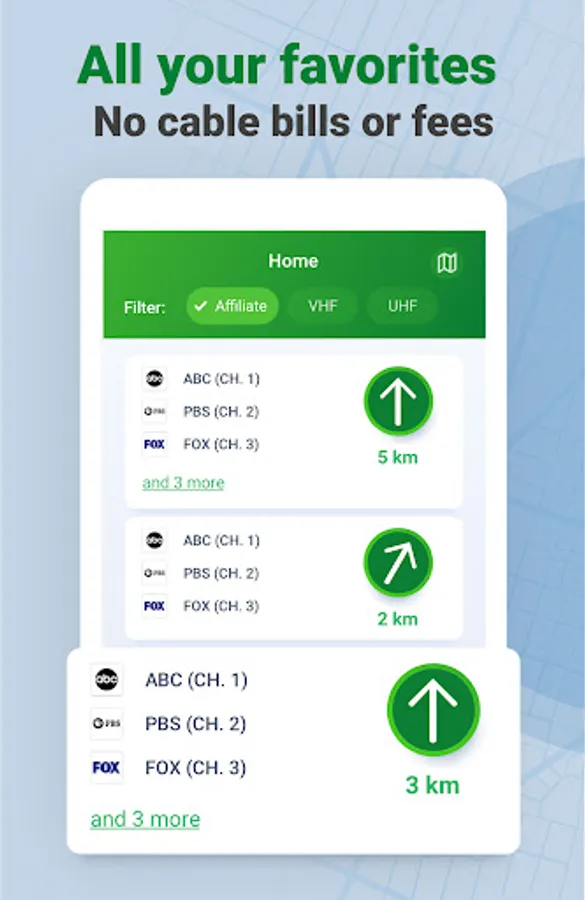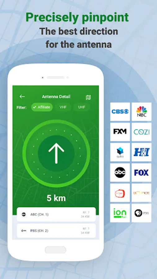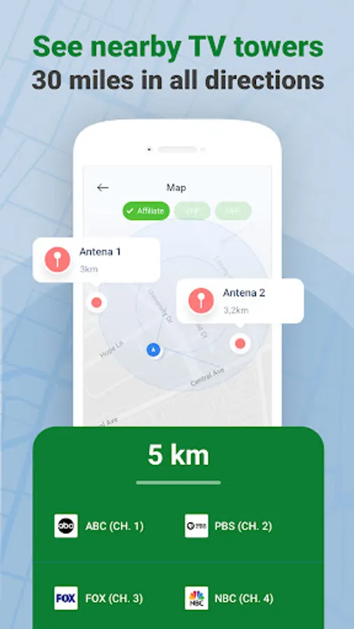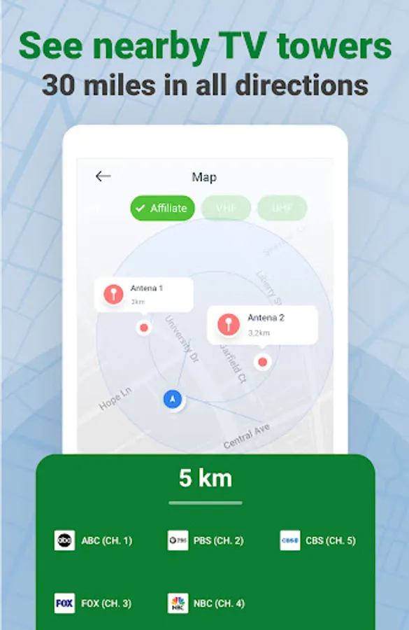 Find nearby TV towers and see available channels