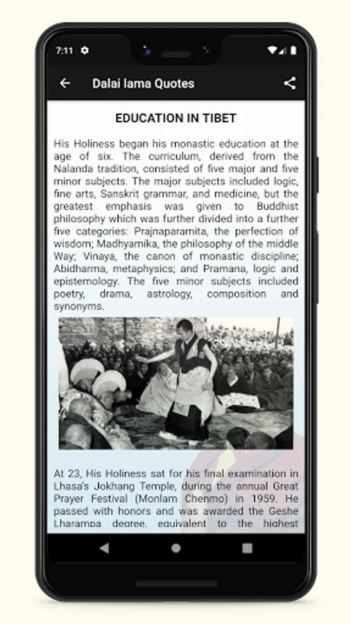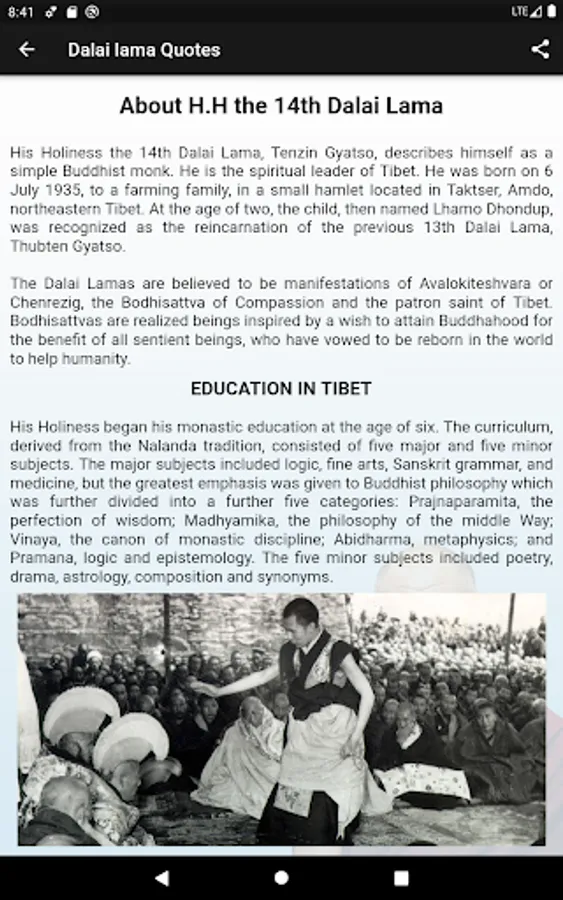 And also it contains brief biography about his holiness the 14th Dalai lama describing about his birth in Tibet, Education, Leadership responsibilities, Democratization, Peace initiatives, Universal recognition, Political retirement and till present day with pictures.