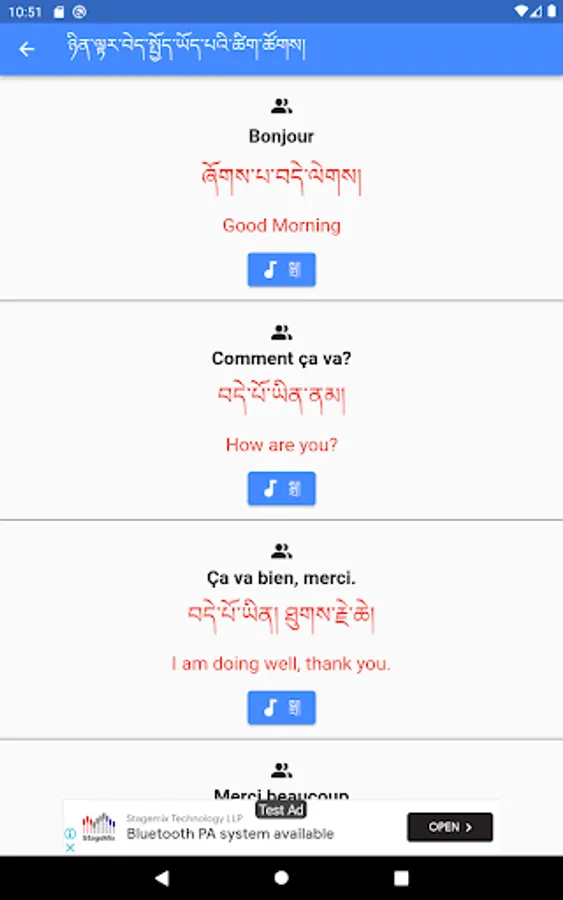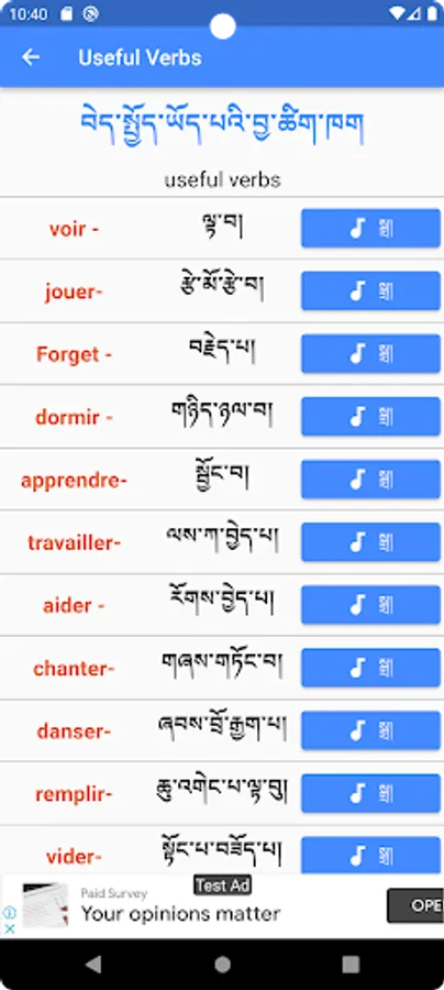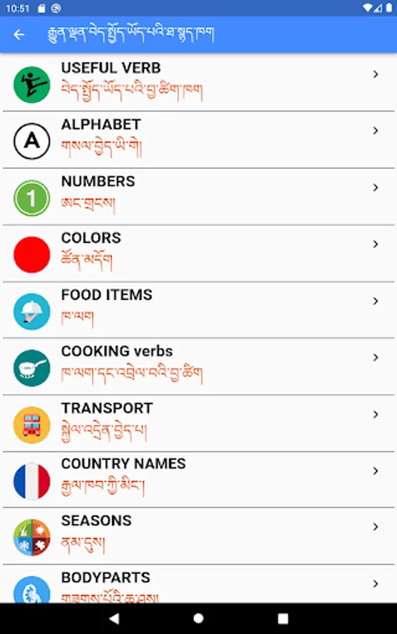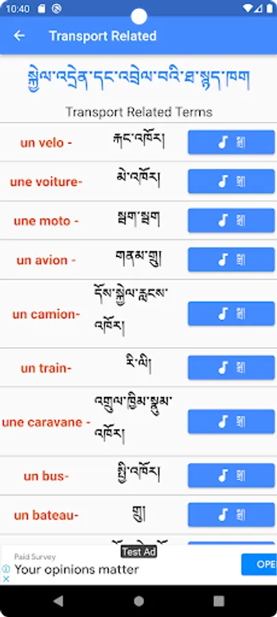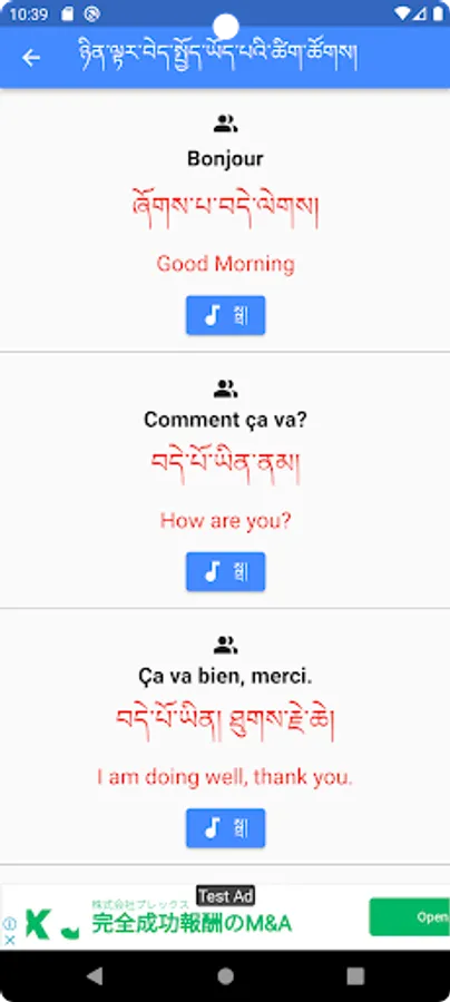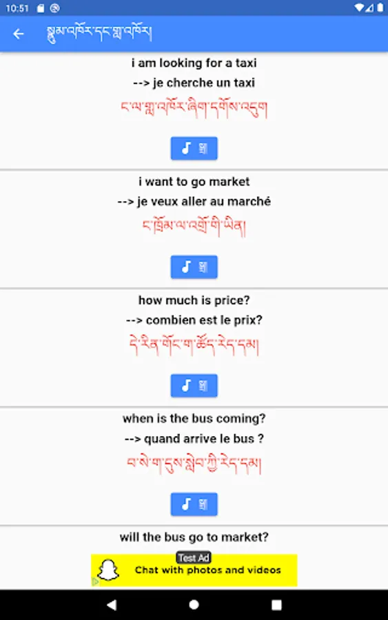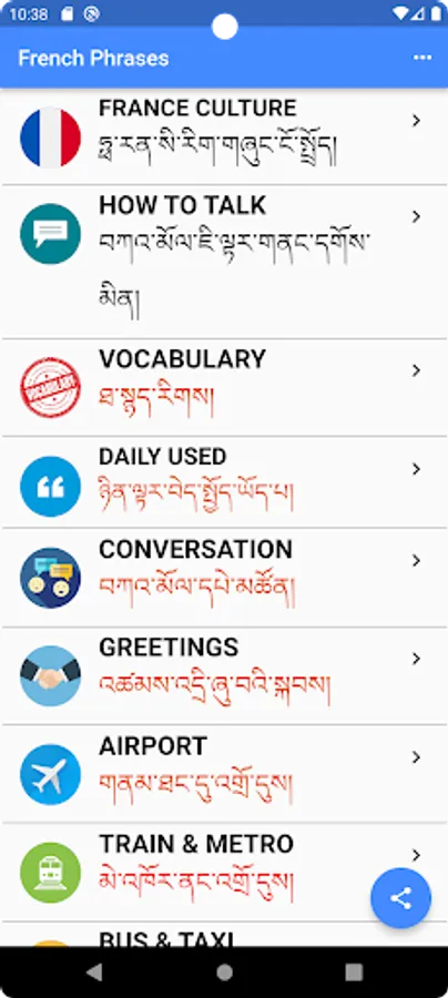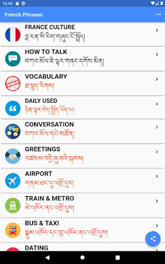 There are many tibetans in French speaking Countries where they struggle to speak in French language. Therefore I created this app which contains daily scenarios where we need to speak in French Language most of the time. It also contains vocabulary including alphabet, numbers, and other verbs which will definitely come in handy while communicatiing. The contents are as follows :