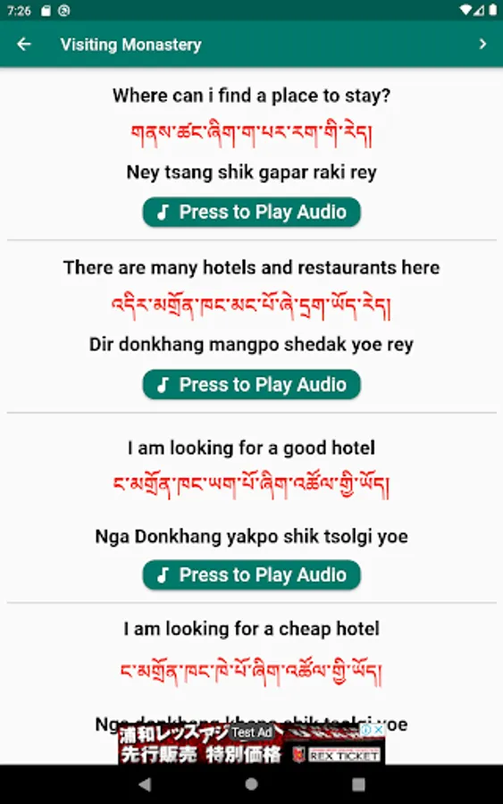 - Also covers Conversations including common phrases, question and answer, introduce yourself, travel directions, bus and taxi, bar, vegetables, weather, going to post office, monastery, hotel and restaurant, places, hospital, shop, grocery shopping, sightseeing, making friends and family. And the conversation contains literal translation with clear audio.