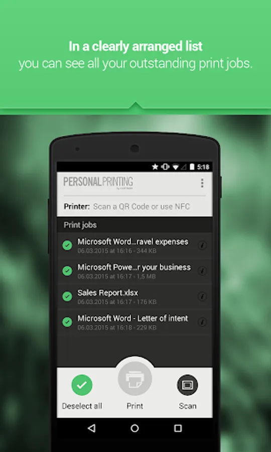 Turn your Android smartphone into a print job release device. Personal Printing is an innovative secure and cost-effective pull printing solution which allows you to use your Android smartphone to release print jobs on any corporate network printer. Just stick barcodes on all your printers, no additional hardware or specific printer is required.
