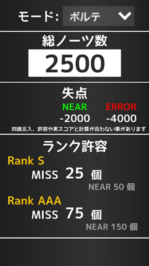 Just enter the number of notes to calculate the allowable number of mistakes in the music game and the number of points conceded per mistake immediately!