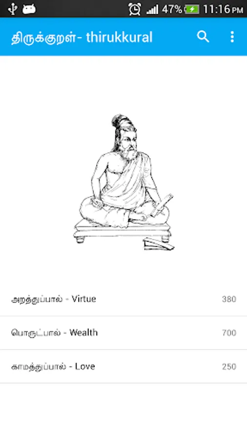 Thirukkural written by Thiruvalluvar ( திருவள்ளுவர் ) is a classic Tamil sangam literature with a universal perspective of ethics in life. The couplets each one concise with seven words, are structured into three sections namely, Virtue, Wealth and Love.