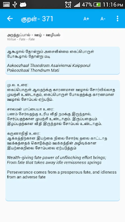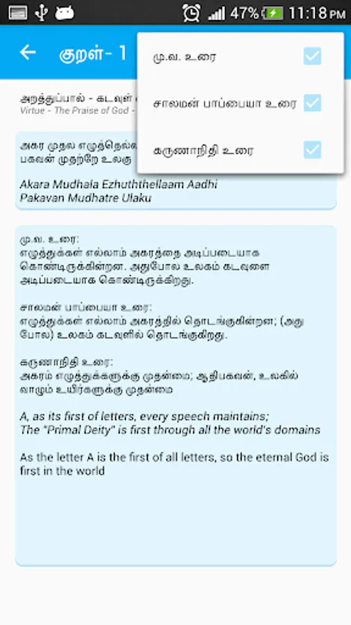Along with the kural/couplets their explanation by Thiru. Mu. Varadarajan (வரதராஜன்) , Thiru. Solomon Pappaiah (சாலமன் பாப்பையா )and Thiru. Karunanidhi (கருணாநிதி ). The english transliteration, translation and meaning is by Rev Dr G U Pope, Rev W H Drew, Rev John Lazarus and Mr F W Ellis. The app comes with integrated bilingual searching, sharing of couplets and other features.