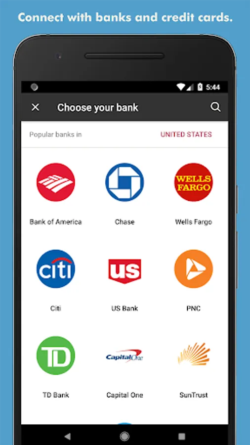 - automatically connect over 14 000 different bank accounts, credit cards or financial services in the United States and around the world. Available connection include; Chase, Bank of America (BofA), Charles Schwab (SCHW), Citi, HSBCnet, PNC, SunTrust, TD Bank, US Bank, Wells Fargo, PayPal, Wealthfront, Betterment, Coinbase, Bitstamp and others.