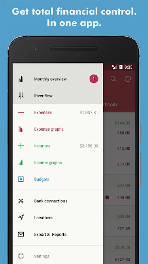 Pro - unlimited financial accounts, unlimited budgets, save receipt photos with expenses, repeat expenses, set bill reminders, unlock with fingerprint - $2.99/month or $19.99/year