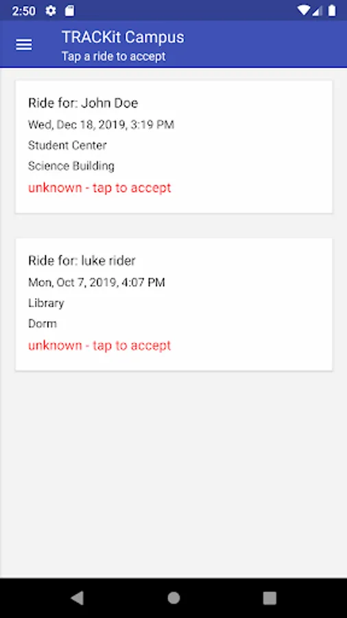 Tracks location and allows driver to manage rides through the TRACKit Campus platform.