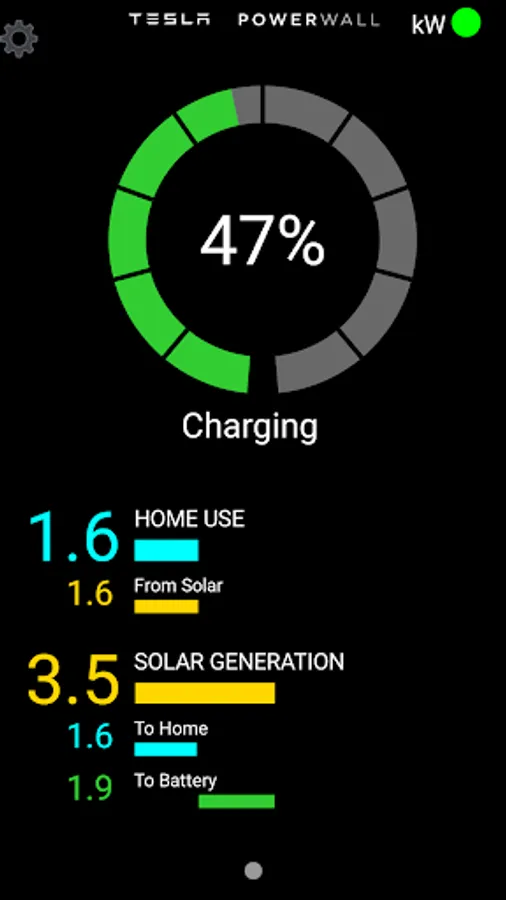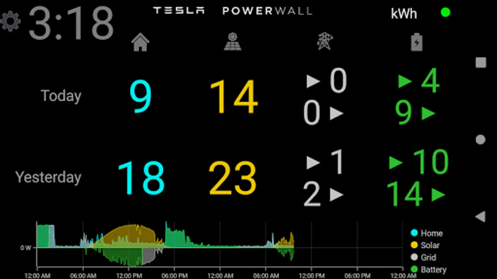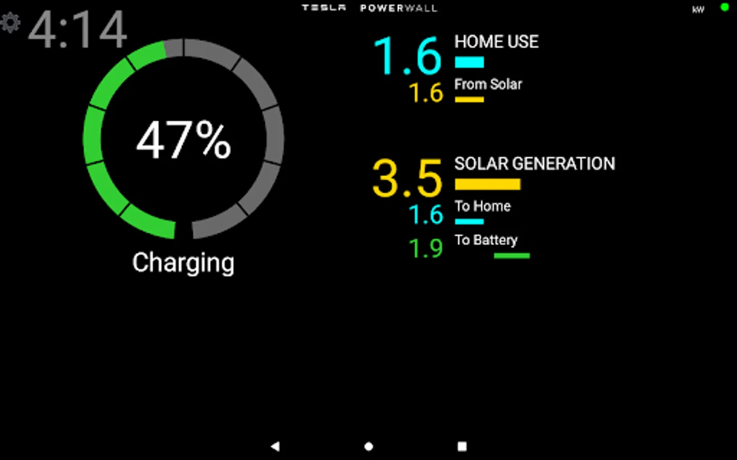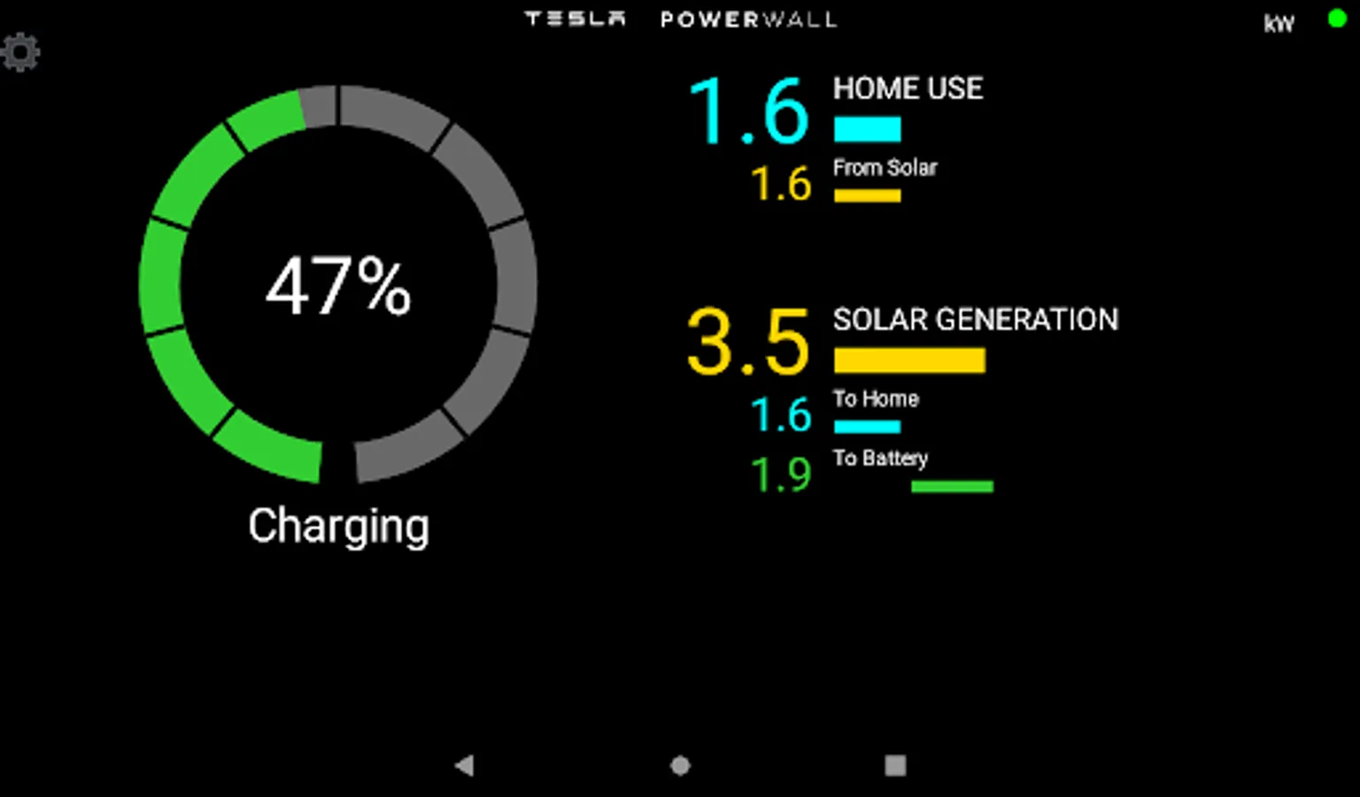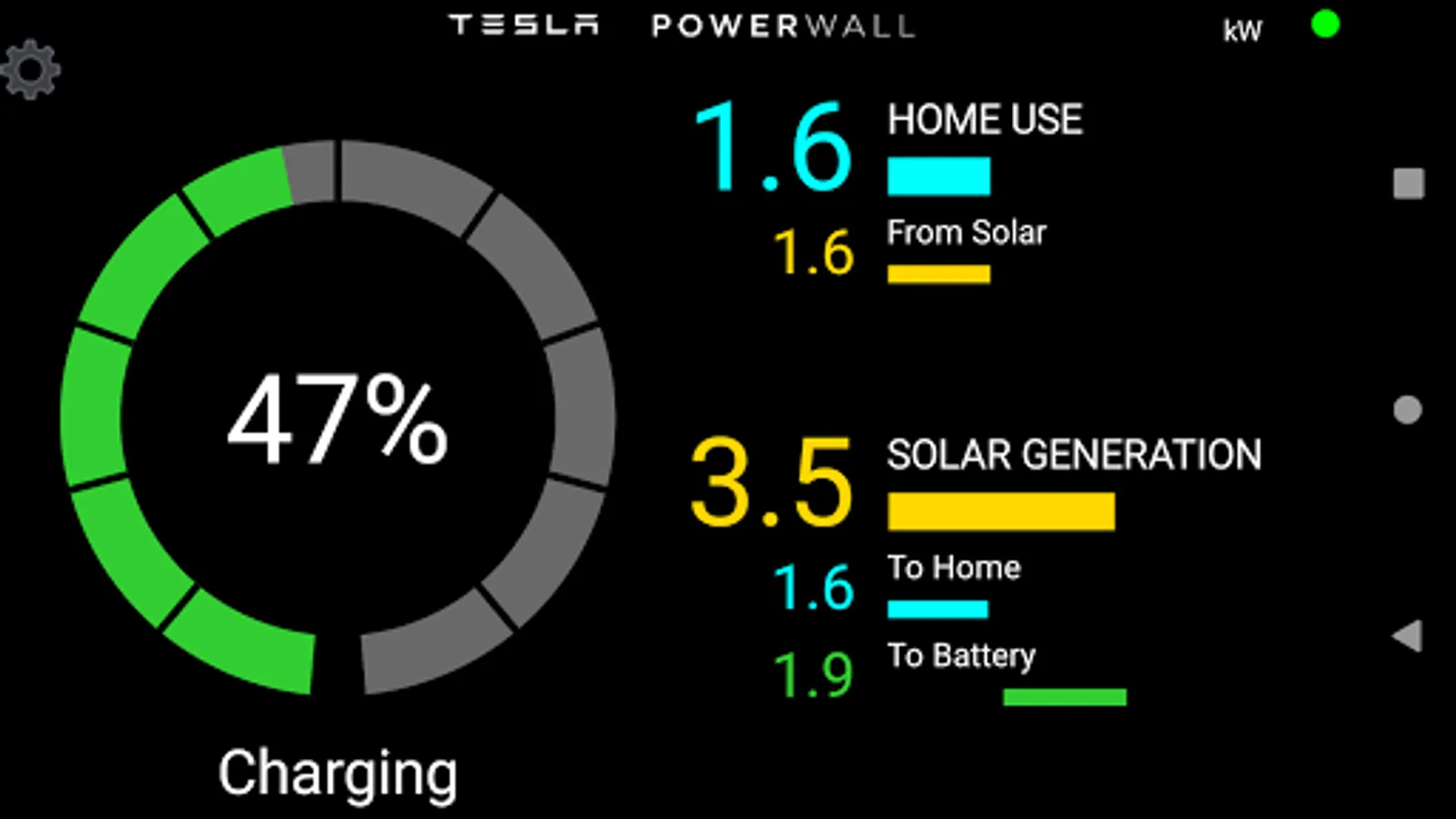 Turn your old phone into a dashboard for monitoring your Tesla Powerwall battery, solar generation and home energy use! This app provides an always-on, glanceable view of your household energy use, storage and generation. Requires a Tesla Powerwall 2 battery system.