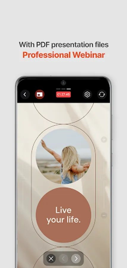 Stream webinar with PDF images. You can resize the camera to any size you want by applying it as PIP to PDF screen, and you can turn the camera on and off at any time. Customize your webinar screen by adding a logo image on PDF.