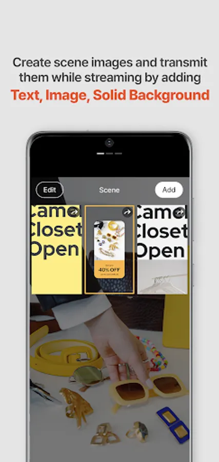 You can add any scene image you want on the camera and content screen(PDF). Create your streaming content by freely making Text, Images, and Solid Color Backgrounds.