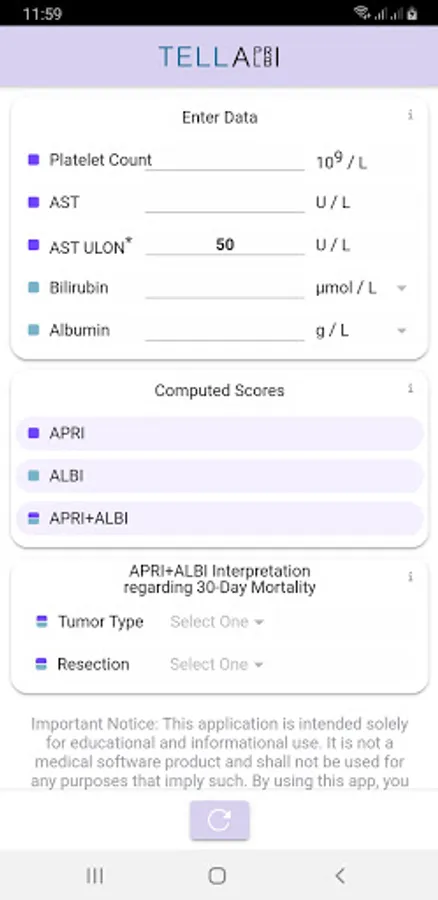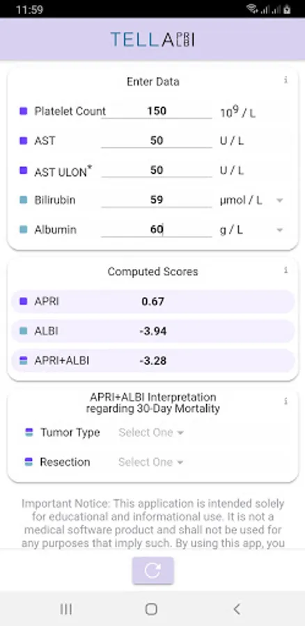 The app is intended for educational use by medical professionals and to allow review of the APRI+ALBI score and its predictive quality. All information entered into the app and computed by it is processed exclusively within the app on the user's device and no information is stored, transmitted or shared by the app.