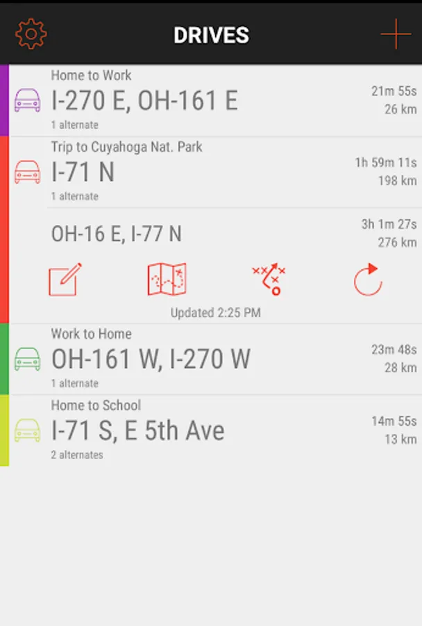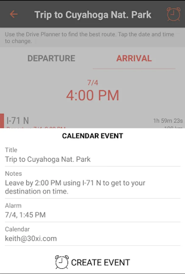 Want to set a reminder so that you leave at the witching hour? Easy Drive can create an event on your Calendar in advance for the appointed time with the fastest route information.