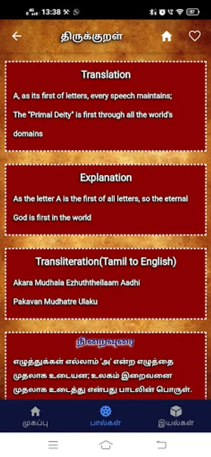 We are proud and happy to release "Thirukkural- Tamil, English with Audio- திருக்குறள்" android mobile app with meanings, word by word explanations and translation in both Tamil and English with AUDIO.