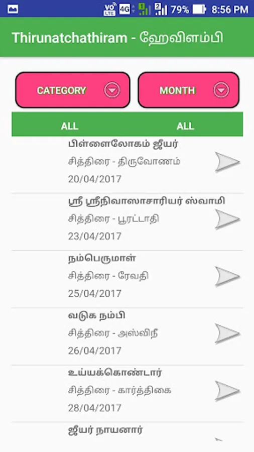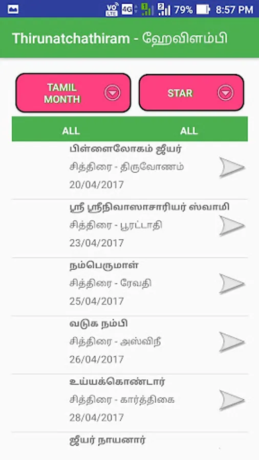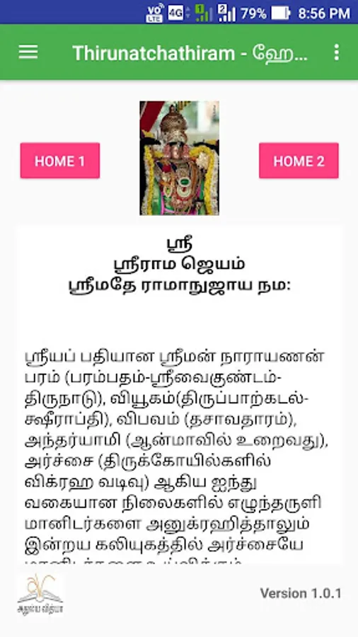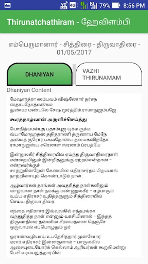 As a first step, we have attempted to capture the details of Avathara Thirunatchathirams, Thaniyans and vAzhi thirunAmam of all Azhwars and various Acharyas in our sampradaya. We hope this would provide an easy access to information for us to recite Thaniyans and vAzhi thirunAmams. With this App, we can also set reminders on important Thirnatchathiram dates. Please feel free to give your feedback and suggestions for improvement @ sridiyasrishti@gmail.com