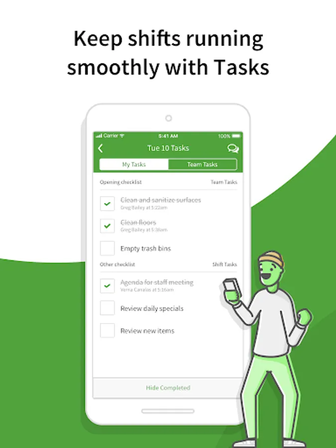 • Team accountability - Shift confirmation, mobile clock in, shift task lists, team task lists, and chat ensure everyone is on the same page.