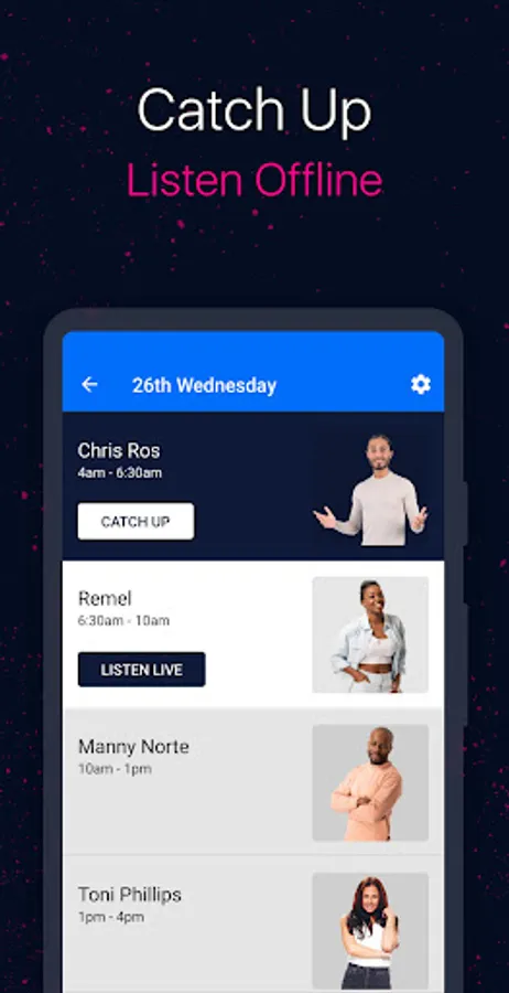 • Catch Up: Your favourite shows from the last seven days are available to listen back to or you can download them – great for offline listening when you’re on the move.