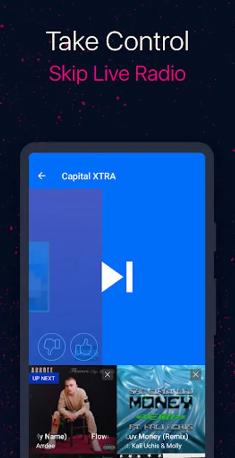• Take Control: Skip live radio. Listen live to Global’s radio brands and skip* any songs you’re not loving – there’s no limit. Plus like and dislike tracks to let us know which songs you're loving - Just swipe away to take control of your favourite radio stations.
