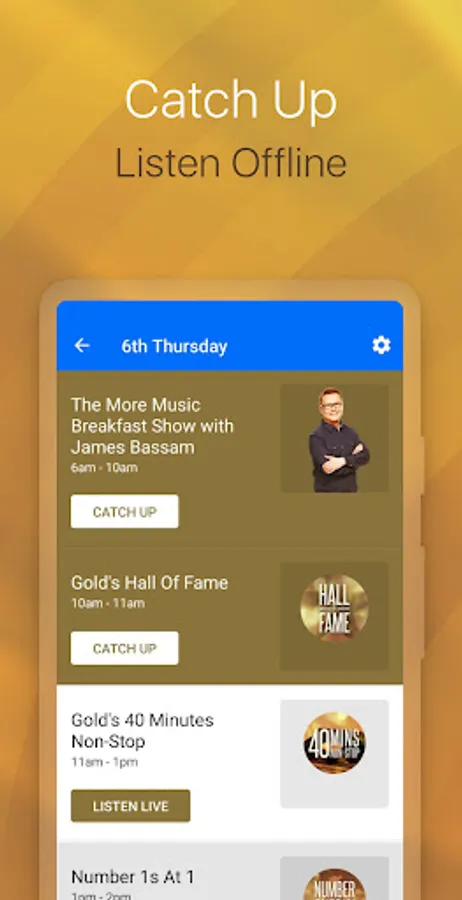 • Catch Up: Your favourite shows from the last seven days are available to listen back to or you can download them – great for offline listening when you’re on the move.