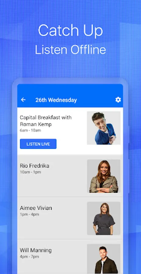 • Catch Up: Your favourite shows from the last seven days are available to listen back to or you can download them – great for offline listening when you’re on the move.