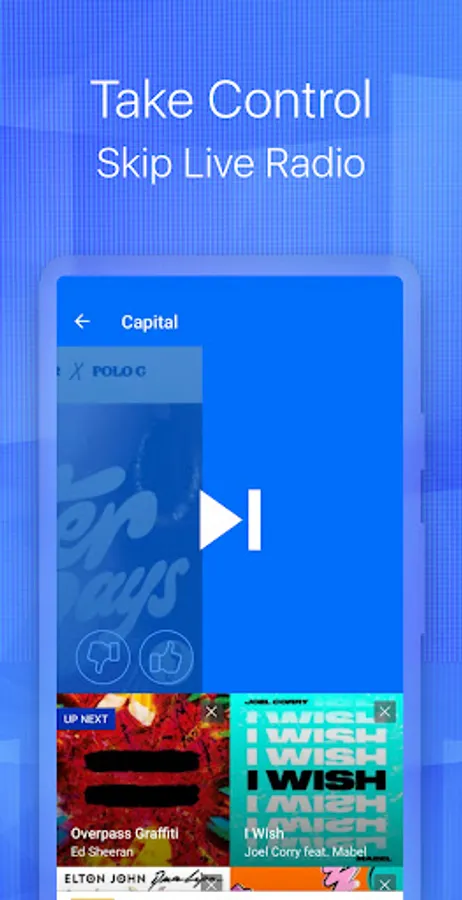 • Take Control: Skip live radio. Listen live to Global’s radio brands and skip* any songs you’re not loving – there’s no limit. Plus like and dislike tracks to let us know which songs you're loving - Just swipe away to take control of your favourite radio stations.