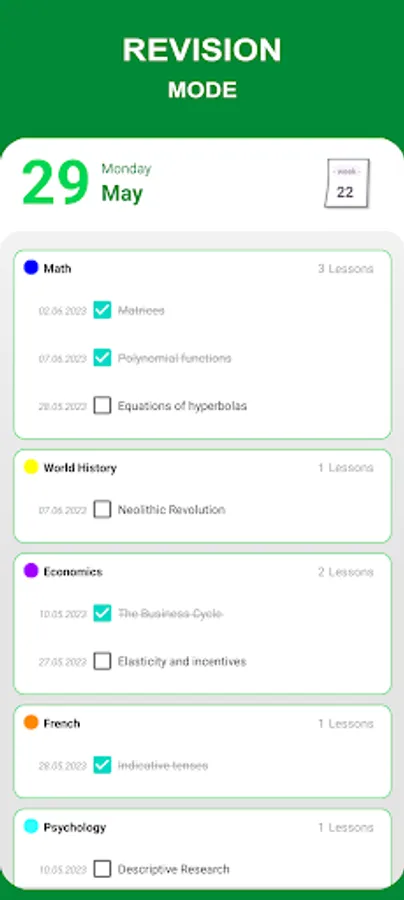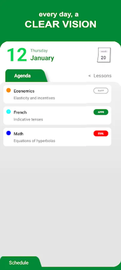 Under the « Courses » tab, each subject is displayed according to the timetable defined. If a lesson has been taken during the day, simply specify its title and Jplanner will propose a learning schedule. Set the parameters of your schedule before validating it.
