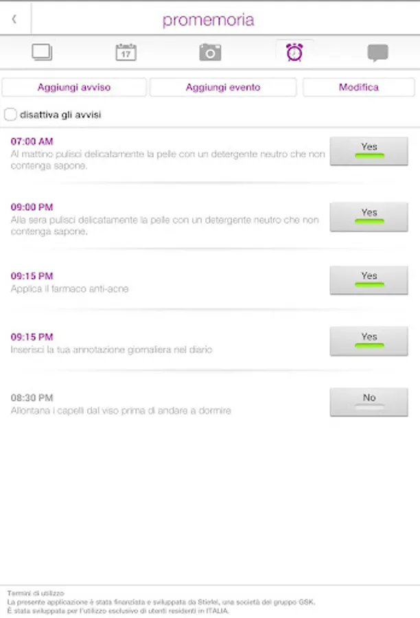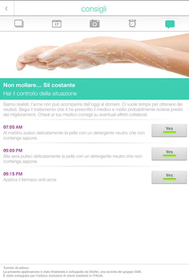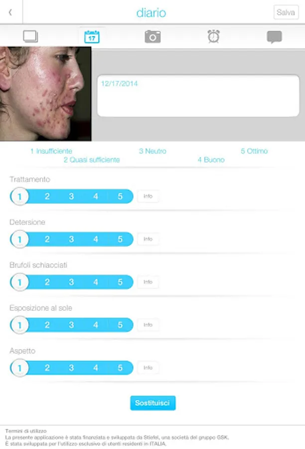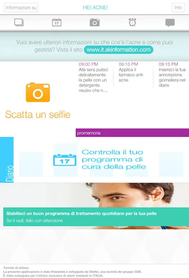 The app Hei Acne! ™ by Stiefel, a GSK company of the group, allows you to monitor your acne over time. Take a Selfie every day, and organize your photos in the gallery application. You can share and track the results during the visit with your doctor or dermatologist, as a support to discuss how to proceed your acne. To take care of the skin every day, you can also learn some useful tips daily and customize reminders and alerts to better follow good habits treatment. Features included in the App: