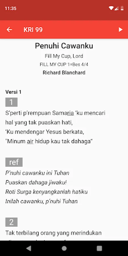 - Songs from the book Song of Persekutuan Reformed Evangelical (KPRI) which contains 175 songs complete with the original author and title.