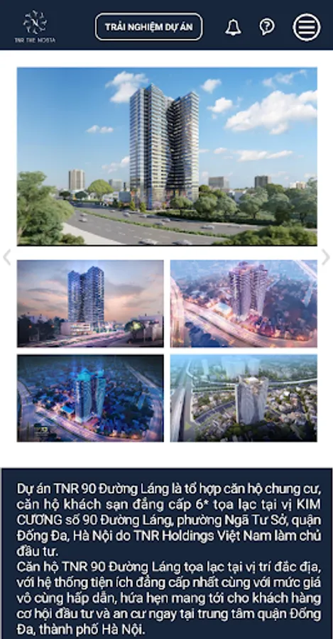 The application allows you to find out information about the TNR The Nosta project (90 Lang Street - Dong Da - Hanoi) in the most complete and attractive way.