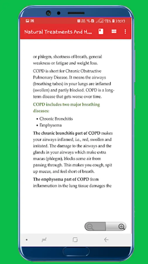 Chronic obstructive pulmonary disease (COPD) is caused by damage to lungs and the airway tubes that carry air in and out of the lungs. Certain people have found relief from COPD symptoms from the following herbal remedies: Eucalyptus: Reduces congestion and helps loosen mucus. Ginger: Breaks down mucus, improves lung circulation and decreases inflammation. Oregano: Contains natural antihistamines and decongestants.