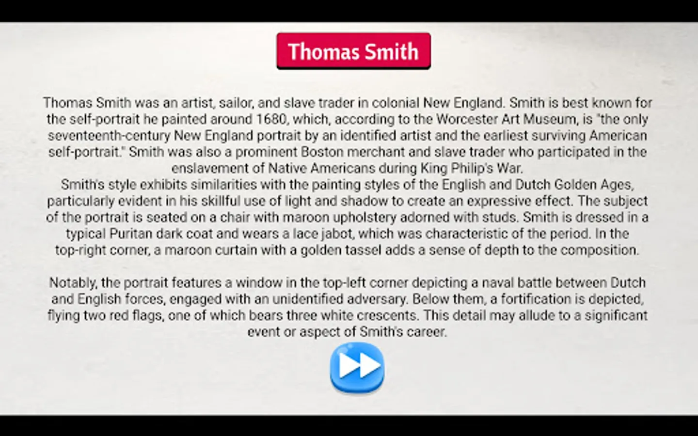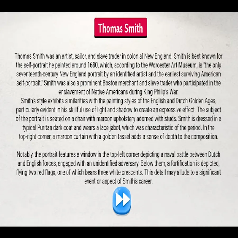 Smith's style exhibits similarities with the painting styles of the English and Dutch Golden Ages, particularly evident in his skillful use of light and shadow to create an expressive effect. The subject of the portrait is seated on a chair with maroon upholstery adorned with studs. Smith is dressed in a typical Puritan dark coat and wears a lace jabot, which was characteristic of the period. In the top-right corner, a maroon curtain with a golden tassel adds a sense of depth to the composition.