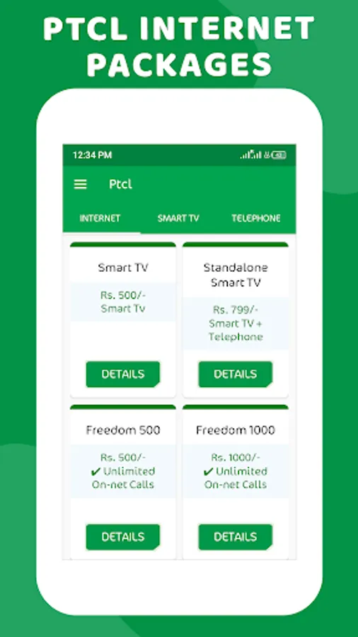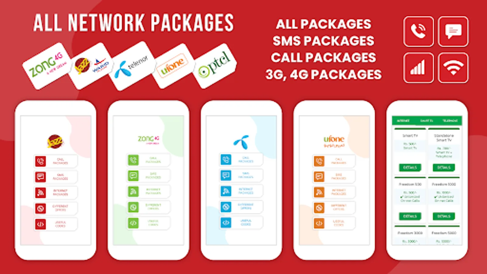 All Network Packages provides call, sms and internet and other packages with complete information. This app contains packages of all major mobile networks available in Pakistan such as Jazz, Telenor, Ufone and Zong. This app also provides package information about PTCL broadband, 3g/4g devices and smart tv.