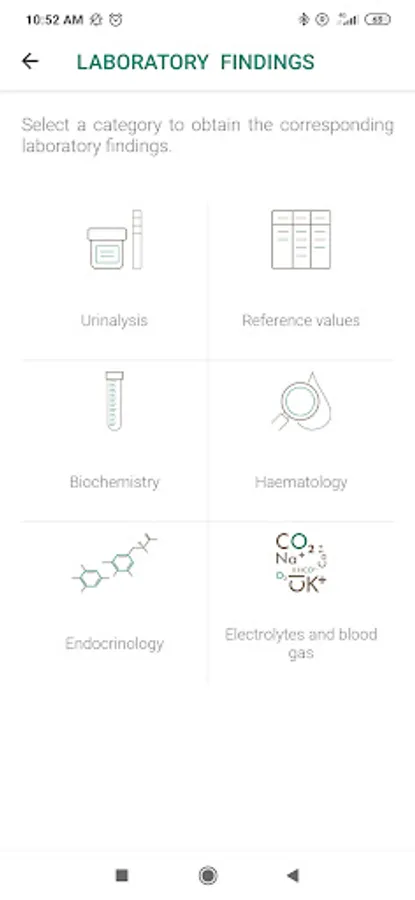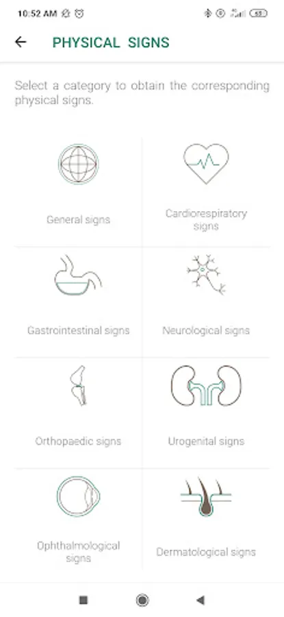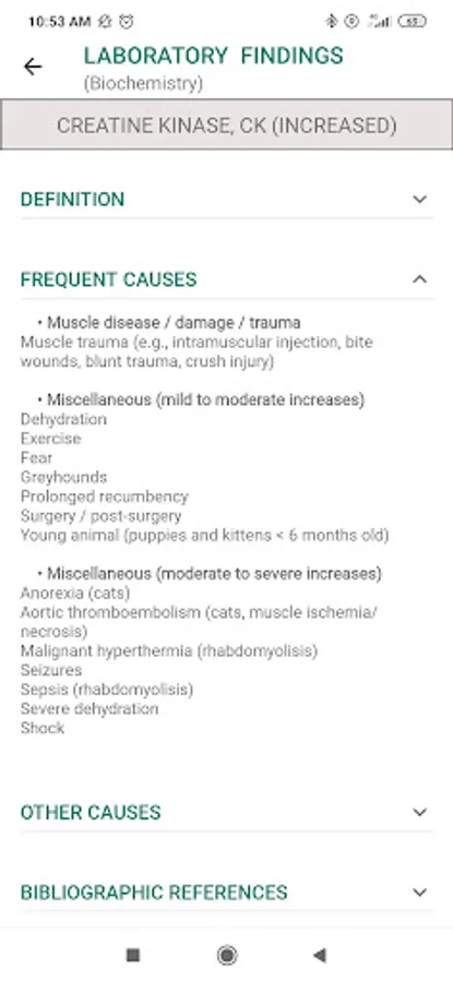 In order to facilitate research, the clinical signs reported by the animal's guardian or observed by the veterinarian are grouped into categories: general signs, cardio-respiratory signs, gastrointestinal signs, neurological signs, orthopedic signs (premium version), uro-genital signs (premium version), ophthalmological signs (premium version), dermatological signs (premium version). Similarly, laboratory results are also grouped by categories: urinalysis, hematology (premium version), biochemistry (premium version), endocrinology (premium version), electrolytes and blood gases (premium version). Laboratory analysis reference values are also provided. It is also possible for the user to directly search for the clinical sign or the laboratory result of interest using a search bar. When the user selects a clinical sign or a laboratory result, he obtains a definition of it as well as the corresponding differential diagnosis (frequent causes and rarer causes).