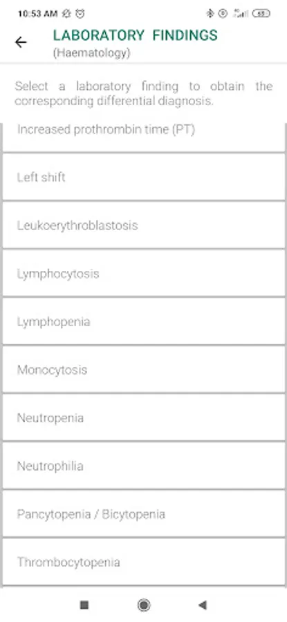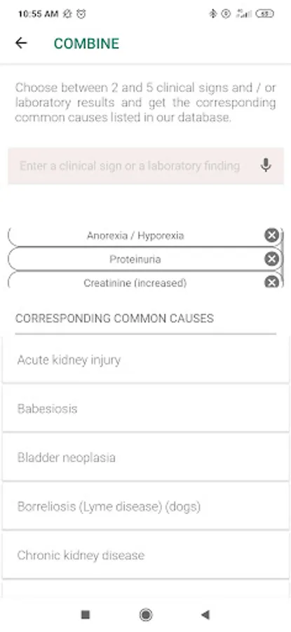 In the premium version, the user can also combine several clinical signs and/or laboratory results (between 2 and 5). The application will then display a reduced differential diagnosis corresponding to the common causes of these clinical signs and/or laboratory results.