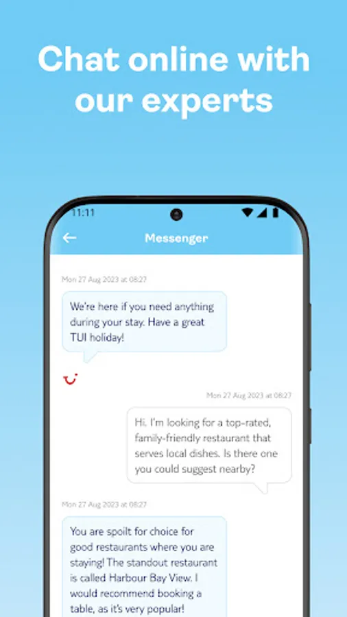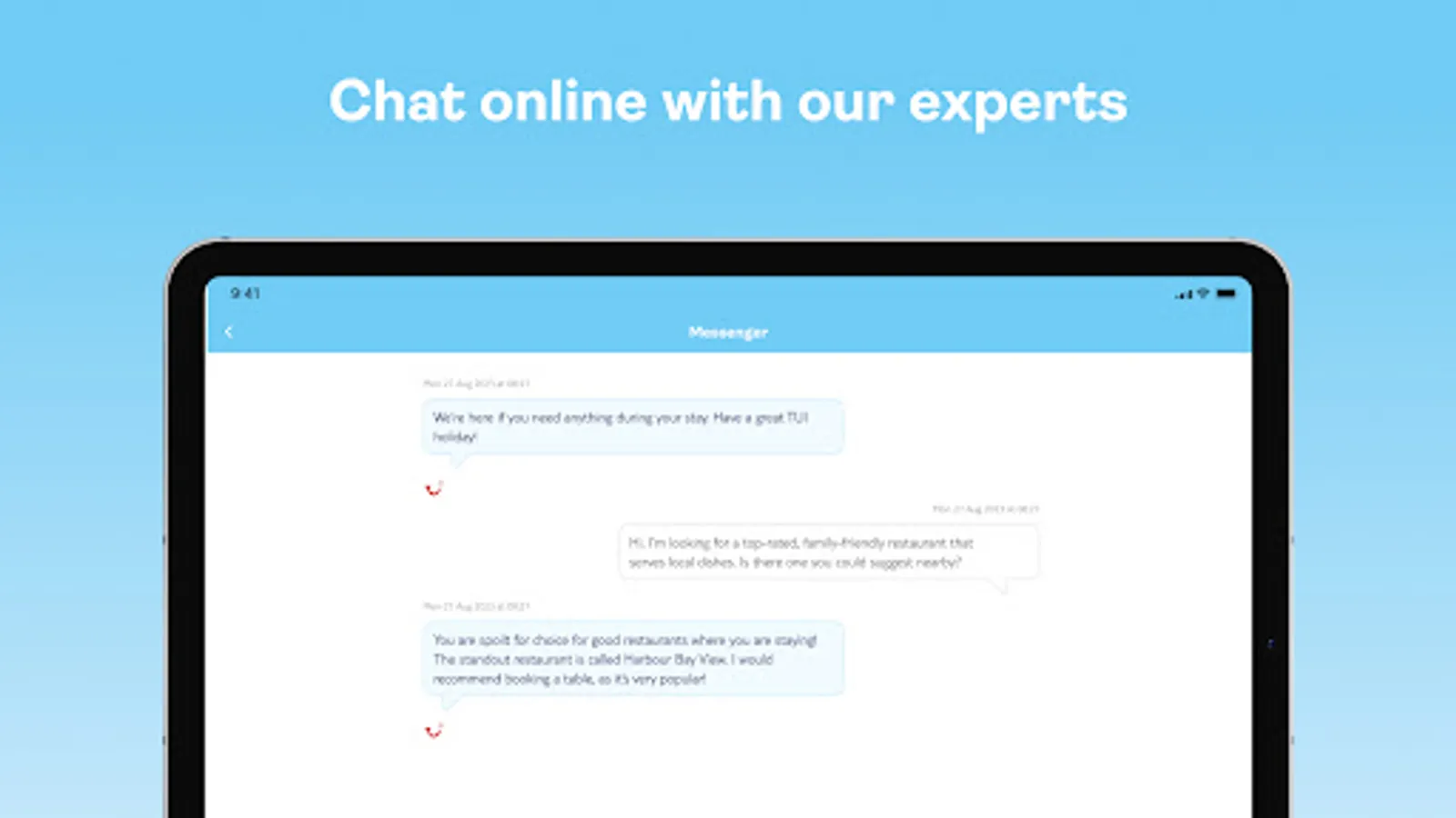 The TUI app puts a holiday expert in your hands. You can browse our full collection of hotels and flights with tailored trip planning and heaps of destination info. You can keep up to date with your trip with a holiday countdown, resort weather forecasts and a flight tracker, too. Plus, you’ve got access to our full range of TUI experiences – from island-hopping days out to walking tours around ancient cities. And, you’ve got direct contact with us whilst you’re on holiday – the app’s chat feature is available around the clock, 365 days a year.
