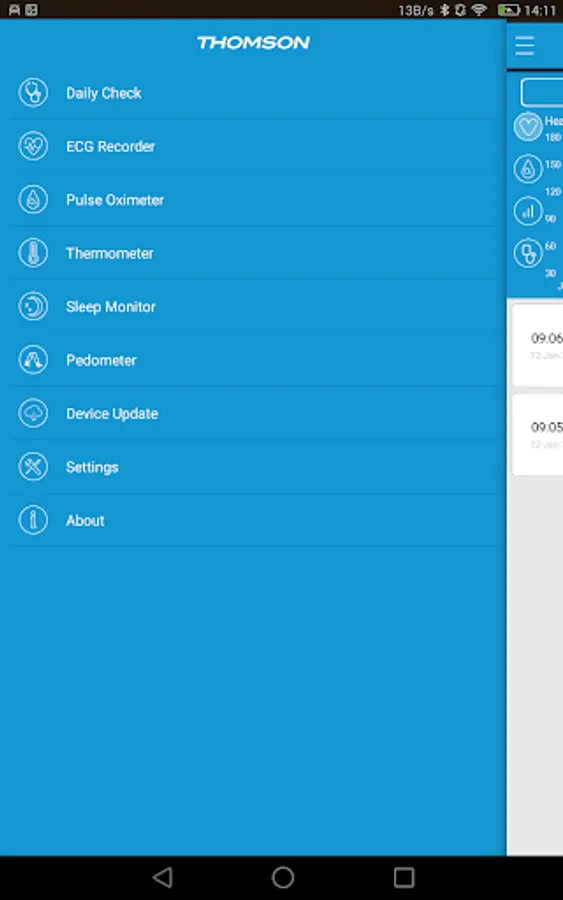 Thomson HC CheckMe is a health application for Thomson CheckMe Health Monitor. It enable users to establish connection with Checkme Health Monitor through Bluetooth. Health data measured by Checkme Health Monitor can be easily exported, reviewed, analyzed and shared on Thomson HC CheckMe application.