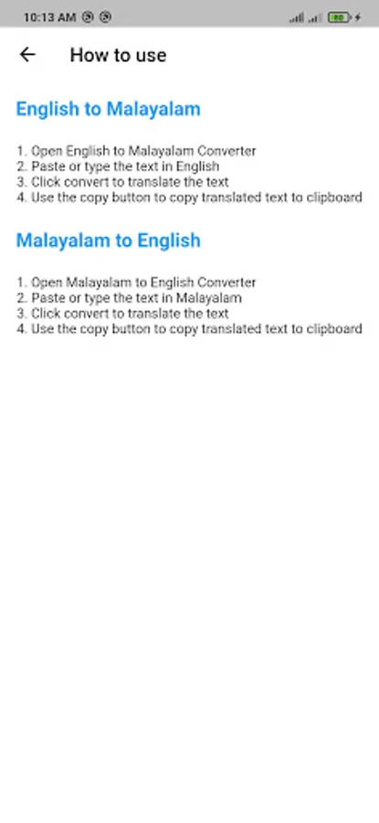 Translate from Malayalam to English and English to Malayalam easily. With the easy to use and simple UI, the translation is faster and easier.